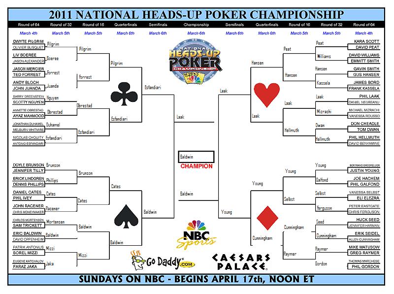 So while I was in L.A., the NBC National Heads-Up Championship was being held in Vegas. One of my favorite things to do is fill out a bracket with predictions prior to the event, much like filling out a March Madness bracket for the NCAA. Many others do the same and it has turned into a friendly competition in the poker community. As the reigning ESPN Fantasy Poker League Champion, and an expert in fantasy poker, I was looking forward to putting my knowledge to use and constructing some successful predictions. Unfortunately things didn’t quite turn out as I planned. Here is how my bracket looked: