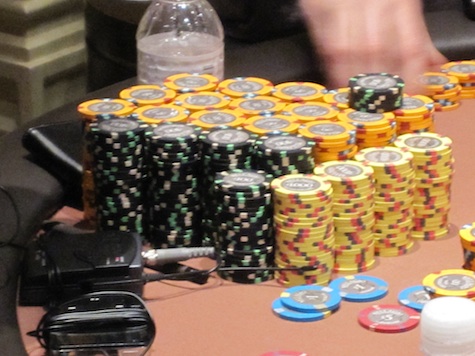 He also tweeted earlier that his movement is becoming labored, though when I talked with him he seemed to be moving just fine. The most common movement has been standing up, which helps to keep him awake at a point where most people will collapse without pharmacological assistance. On the mental side, he still seems relatively fresh, considering how long he’s been at it. The hallucinations he’s expecting haven’t kicked in yet, and he’s still able to read the board without any problems. That's good, because about 10 hours ago he brought out his entire $100,000 stack and one other player at the table matched him - a mistake against him could be bad news indeed.